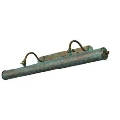 Lunga lampada da quadri Beno con decorativo paralume metallico Beno è una lampada che si accompagna bene agli arredamenti antichi in quanto caratterizzata da uno stile nostalgico e da una finitura verderame di effetto autentico. Il paralume metallico è riccamente decorato. Vi si montano quattro sorgenti luminose che nell’insieme proiettano sul quadro sottostante una luce bella e uniforme.